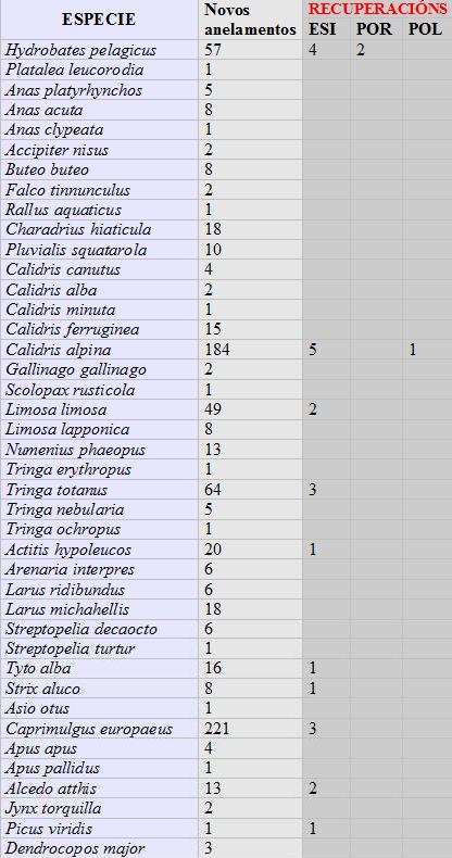 Un total de 816 capturas, con 790 novos anelamentos e 26 recapturas (23 españolas e 3 estranxeiras), o que supón un inxente traballo de campo debido á dificultade de captura deste grupo de aves. Algunhas marcáronse durante a toma de mostras para o seguimento da gripe aviaria (anátidas e limícolas) ainda que, na meirande parte dos casos foron trampeadas no desenvolvemento dos diferentes estudos que están a desenvolver os membros do noso grupo.